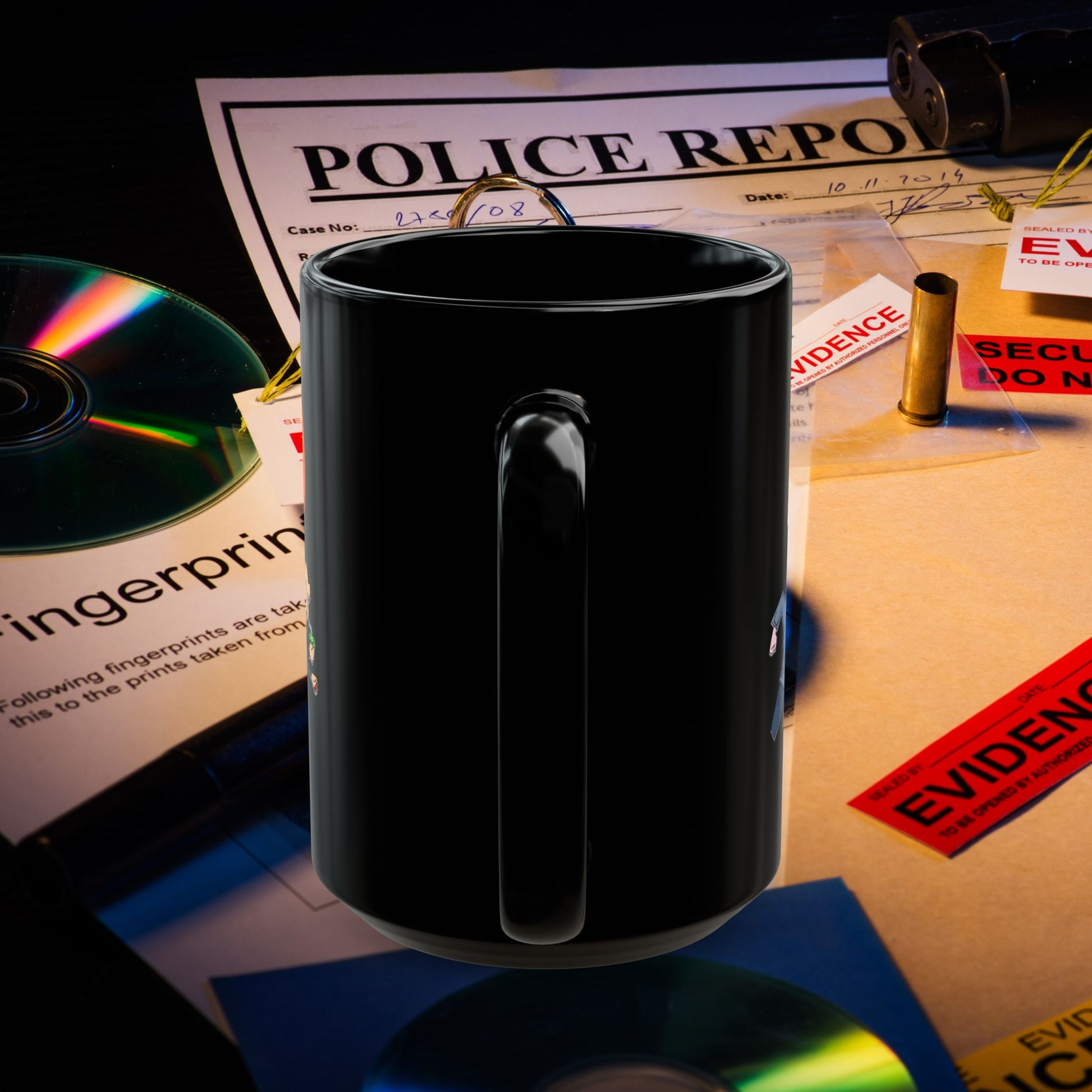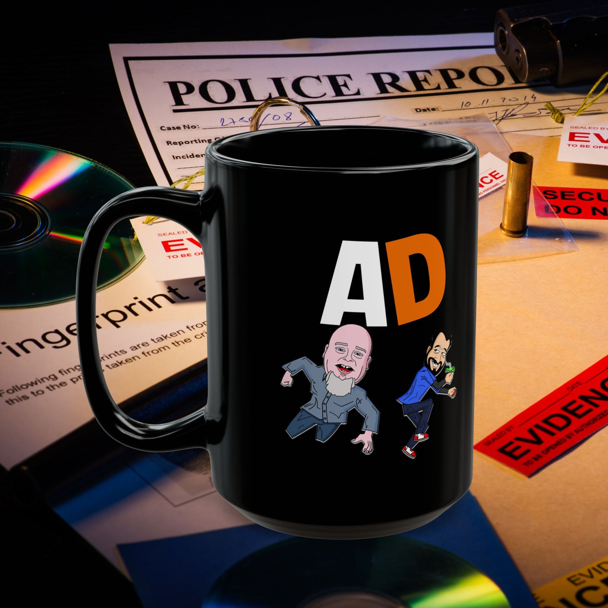 The iconic AD logo anchors the scene, while fingerprint cards, shell casings, and a suspiciously bureaucratic police report set the tone. It’s the kind of mug that makes your coworkers ask, “Wait… what is this?” And that’s exactly the point.