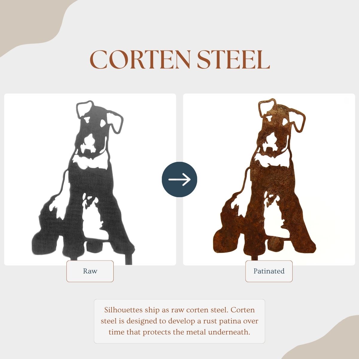 Metal Rescue silhouettes are handmade in the United States from sturdy 11 gauge premium weathering steel, also known as Corten steel. They are designed to develop a beautiful patina rust coating that will change over time, protecting the steel underneath. This silhouette ships out as raw steel and will develop its patina if left in the weather or frequently exposed to wet conditions. The color of the patina should change over time, starting as brighter orange tones and changing to darker brown tones.