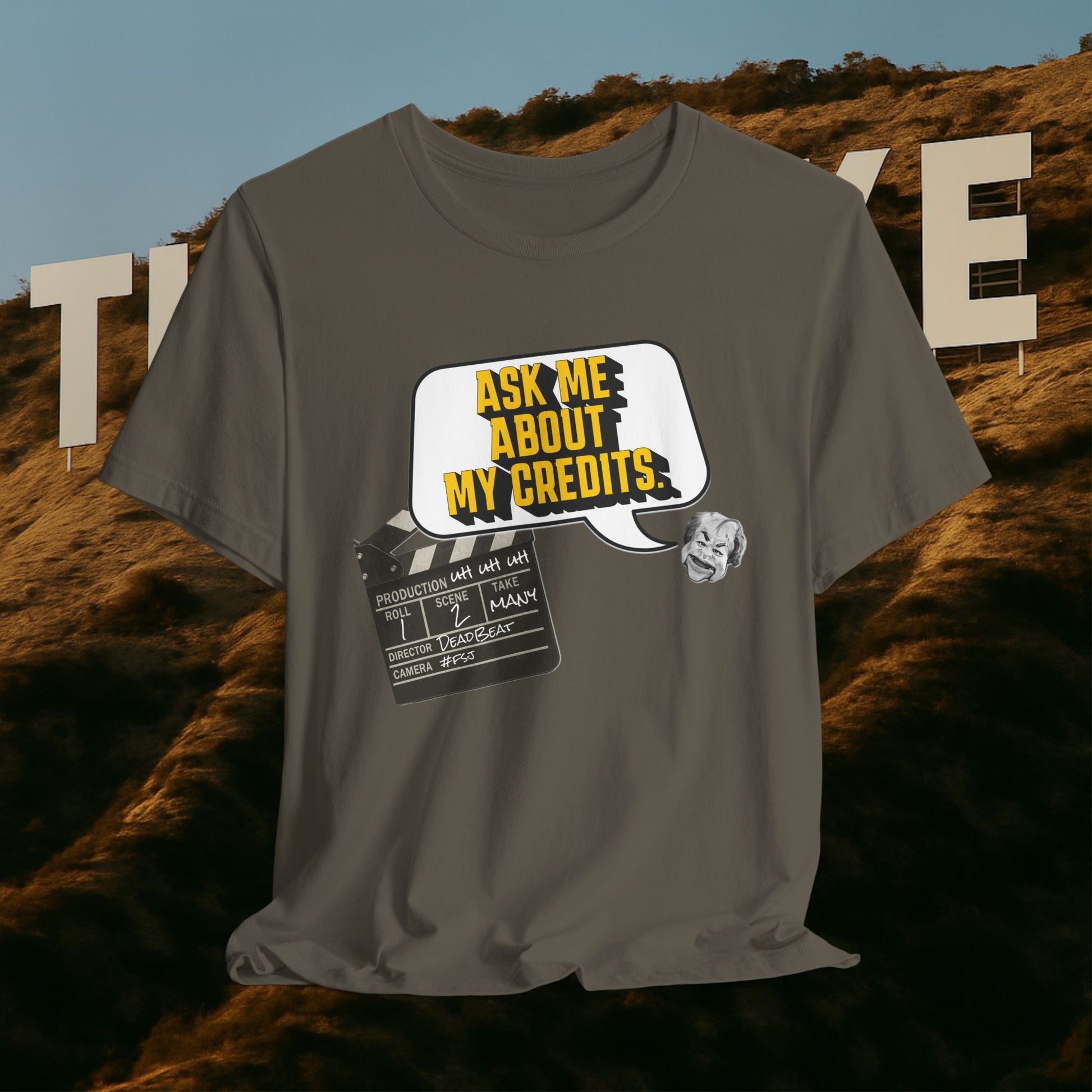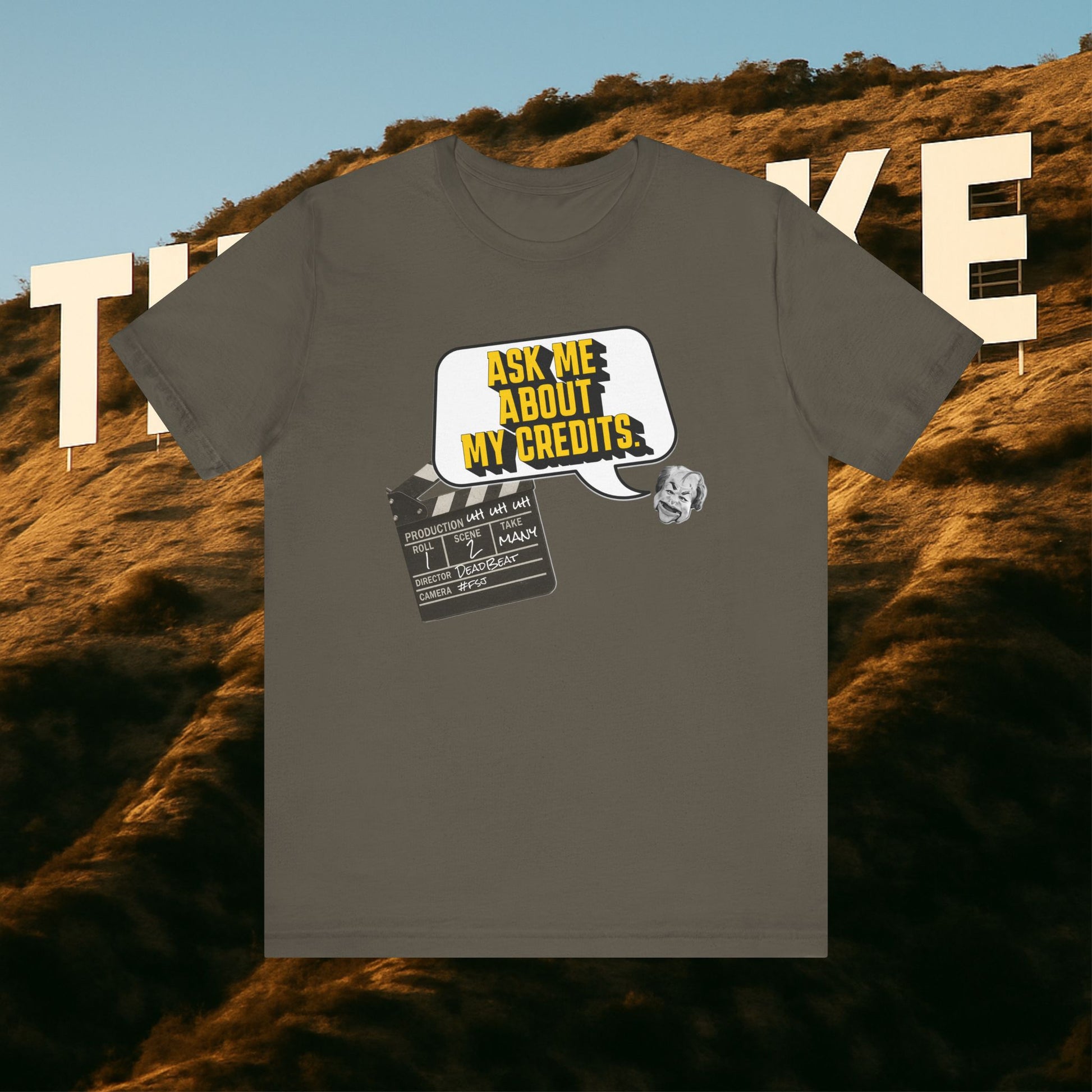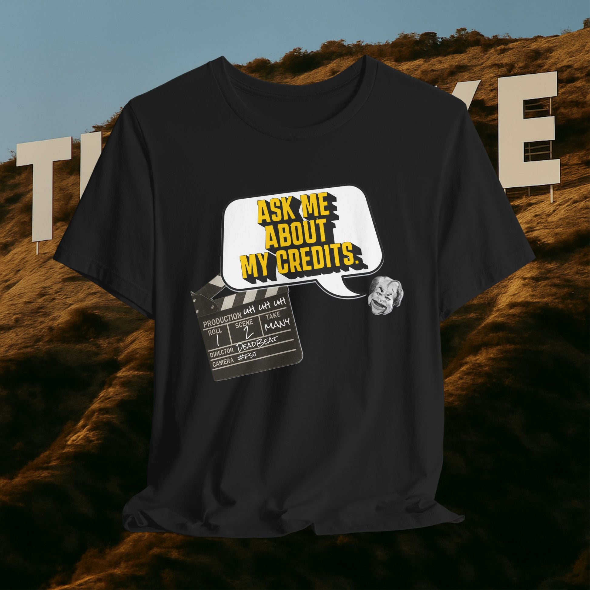 Some people hand out business cards. Some people update LinkedIn. And then there’s this guy—the Deadbeat who decided his résumé belongs on a T‑shirt. Scene E, Take: Many, Directed by Nobody Important… yet somehow he’s still wearing it to every gig, every podcast, every family barbecue.