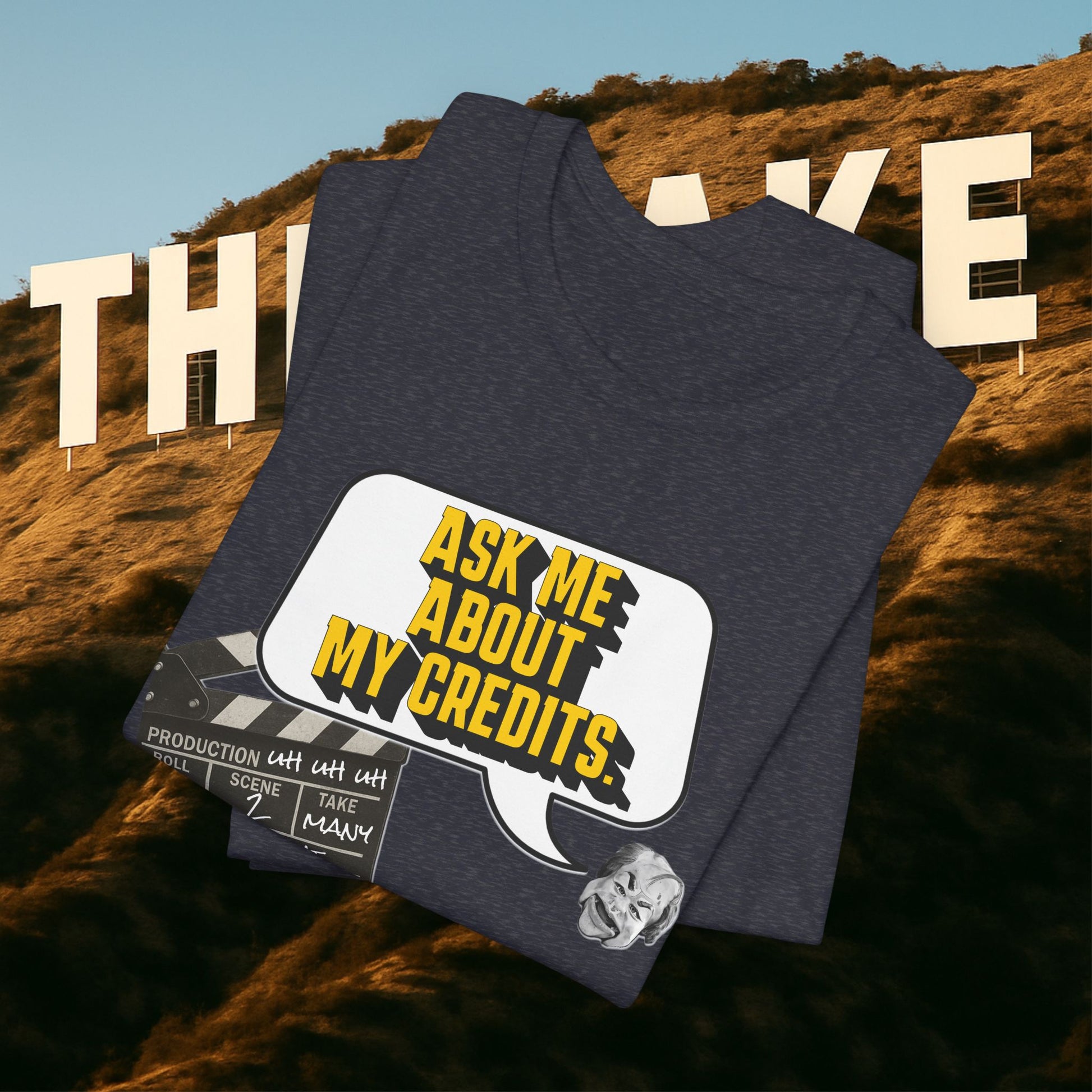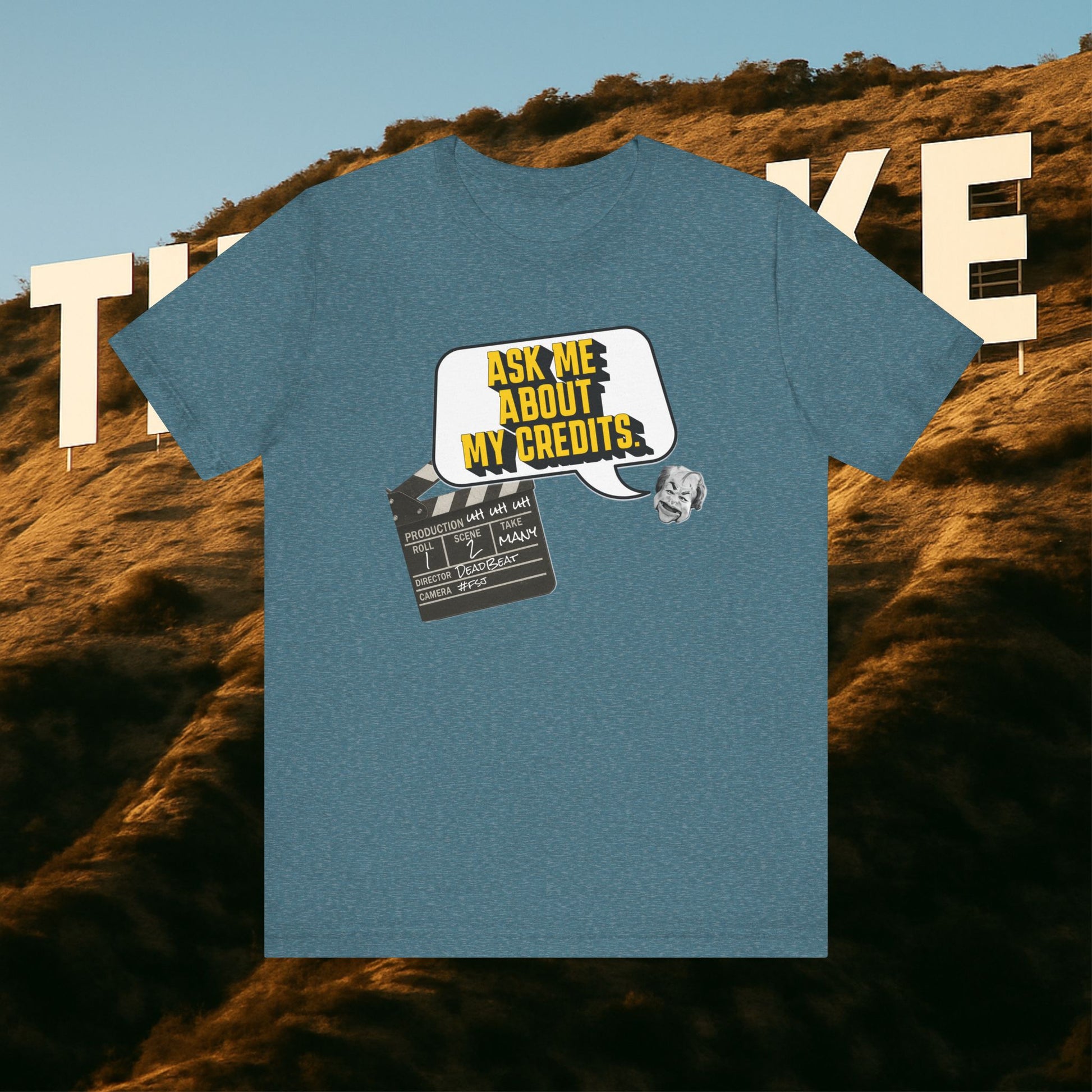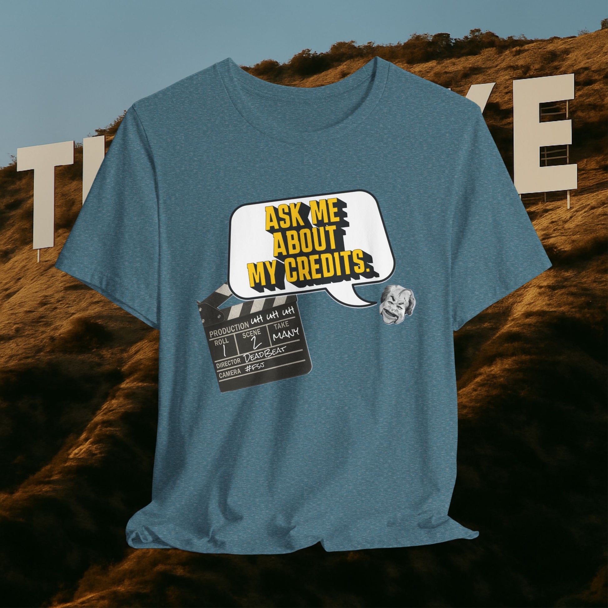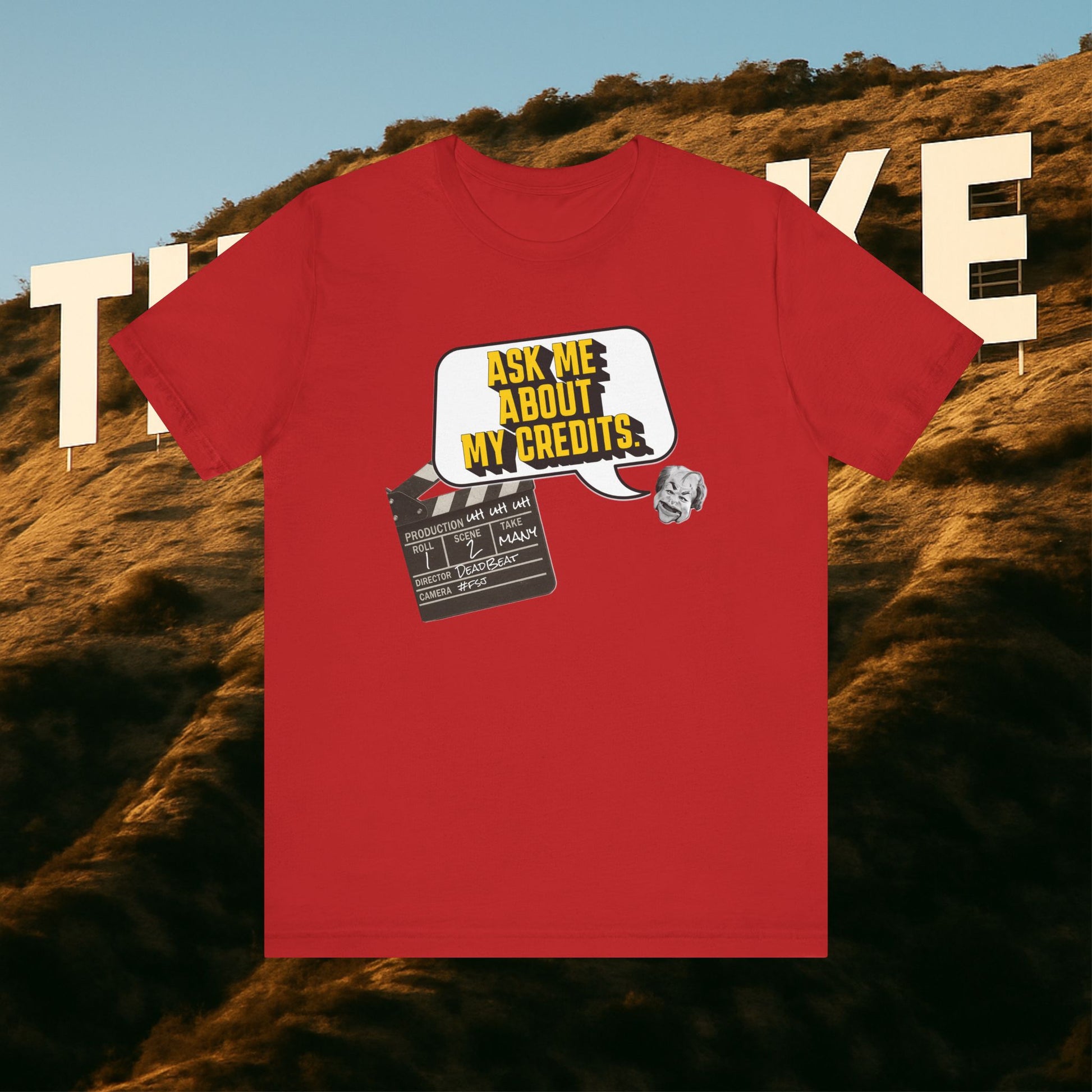 Some people hand out business cards. Some people update LinkedIn. And then there’s this guy—the Deadbeat who decided his résumé belongs on a T‑shirt. Scene E, Take: Many, Directed by Nobody Important… yet somehow he’s still wearing it to every gig, every podcast, every family barbecue.