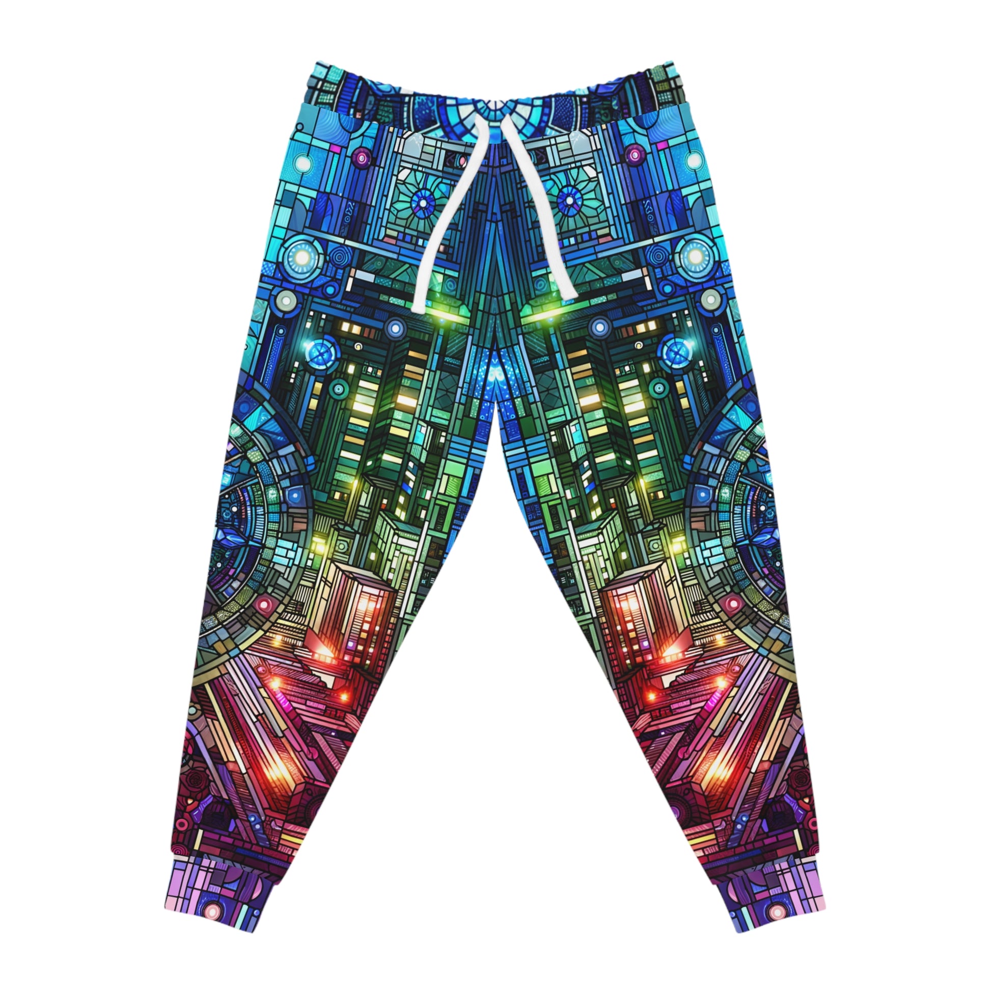You just found the pants your imagination didn’t know it needed. The GeoGlow Joggers are a full-body power-up—laced with pixel-perfect geometry, retro-futurist gradients, and a whole lotta swagger. From cool blues and purples at the waist to molten oranges and reds on the cuffs, this technicolor transition is pure movement—like you’re walking through a prism.
