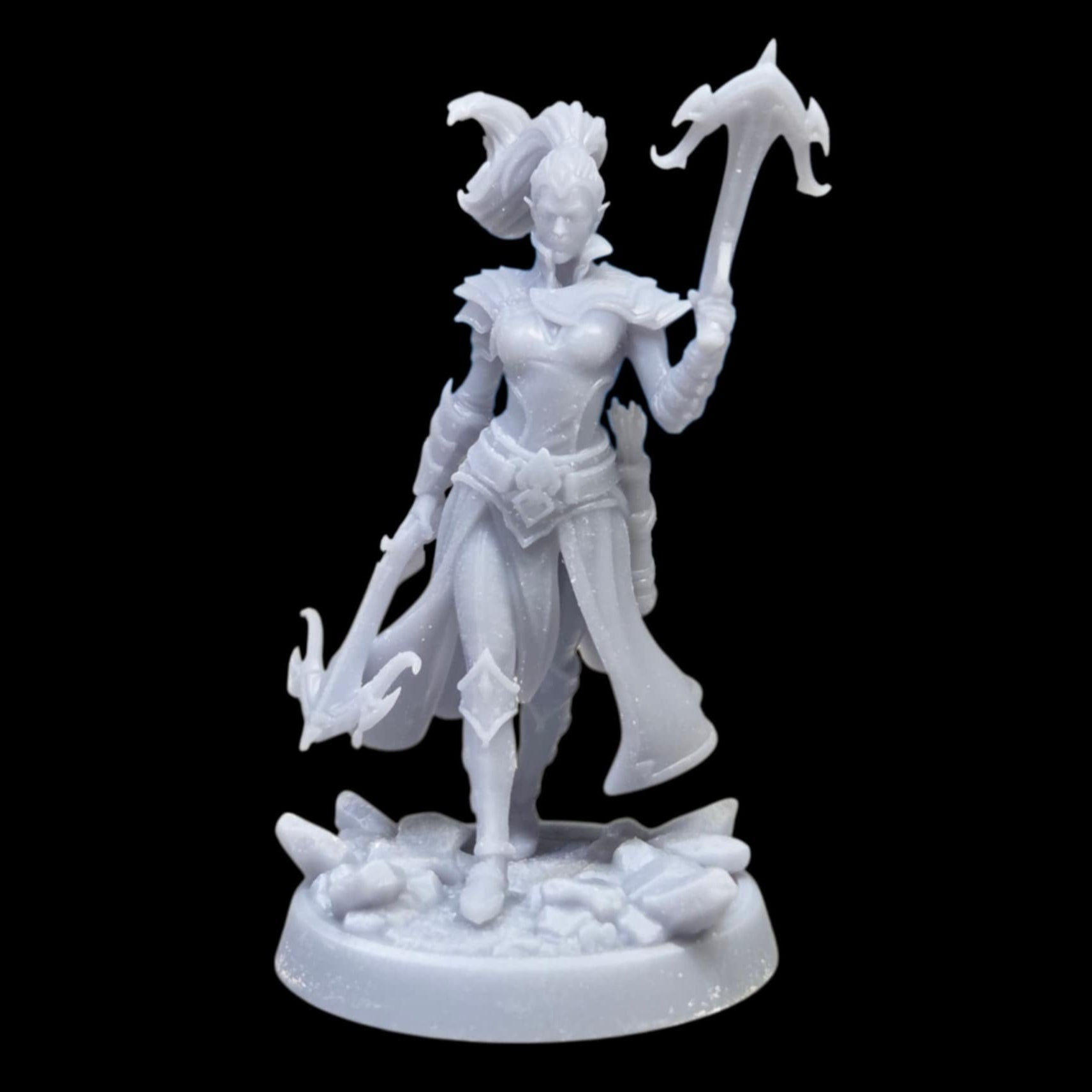 Livia, a dark elf rogue miniature, stands poised with dual weapons, perfect for Dungeons and Dragons, Pathfinder, or Warhammer campaigns. Her intricate armor and deadly blades capture the essence of stealth and precision in any fantasy tabletop adventure.