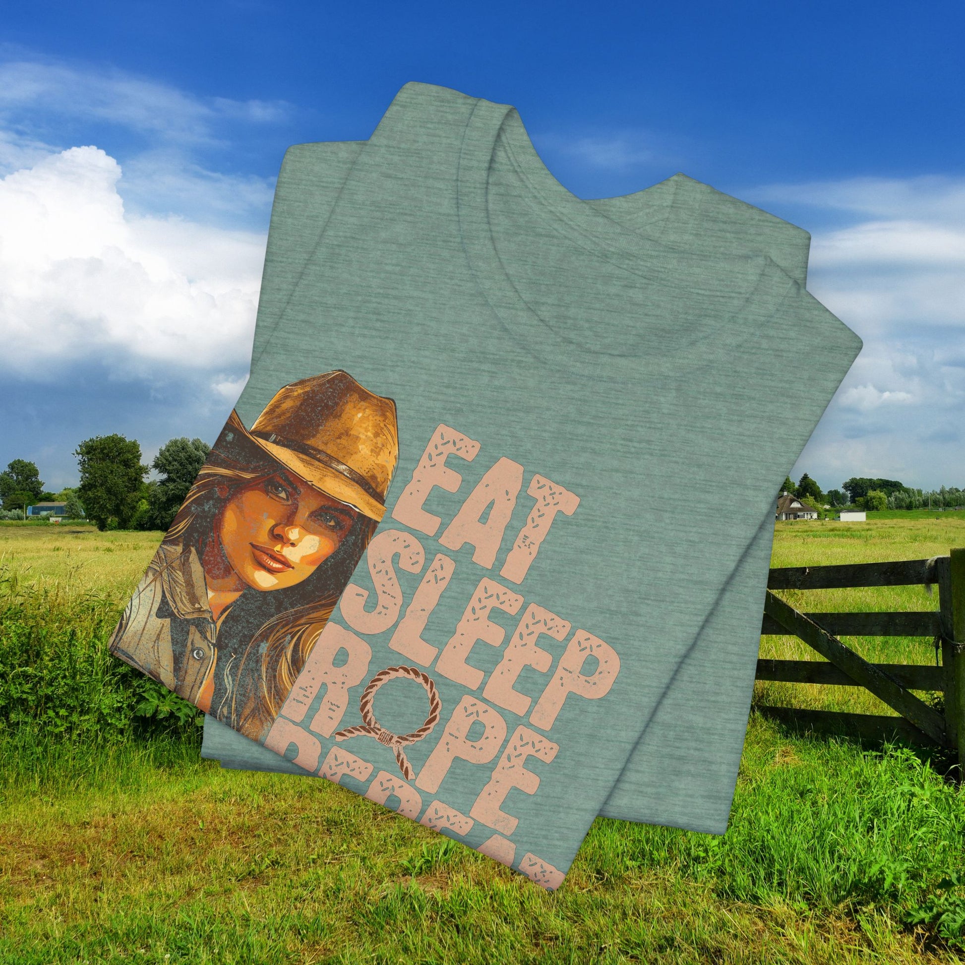 Rustic Cowgirl Tee - Eat Sleep Rope Repeat - Perfect for Country Lovers, Gift for Horse Riders, Western Style Shirt, Casual Wear, Farm [...]