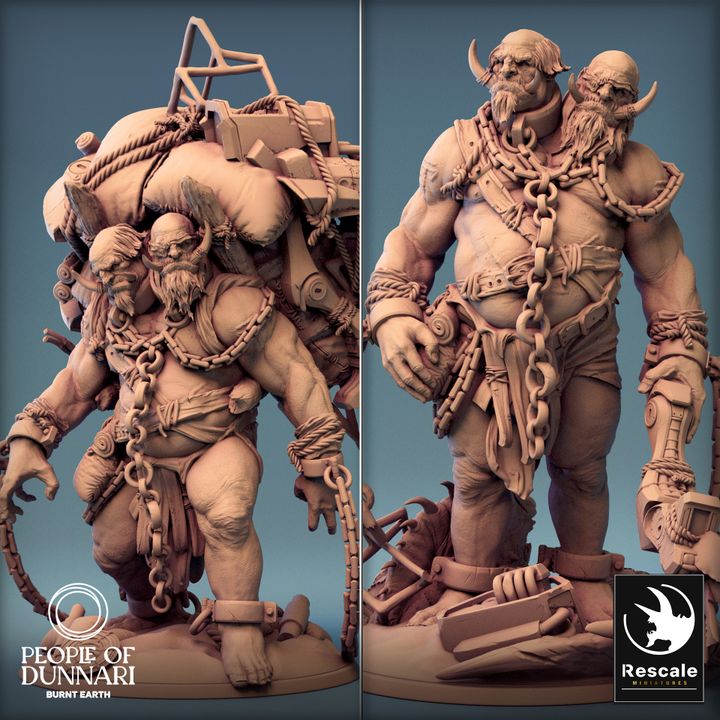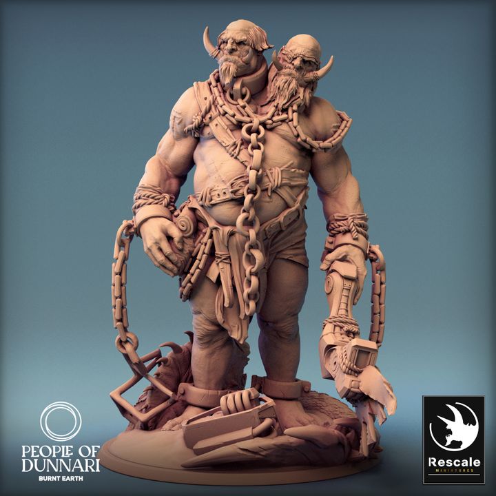 A two-headed Sand Ettin, draped in heavy chains and scavenged machinery, with one mechanical arm. Perfect for use in desert wasteland settings in games like Dungeons & Dragons, Pathfinder, and Warhammer. Depicts a scavenger giant, ideal for encounters in post-apocalyptic or fantasy TTRPGs.