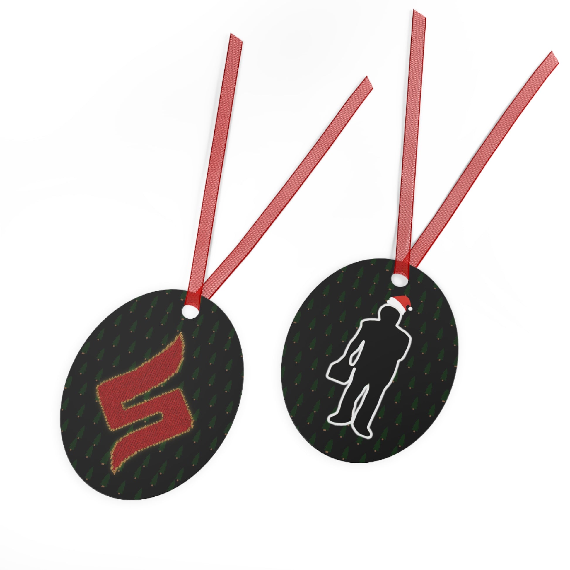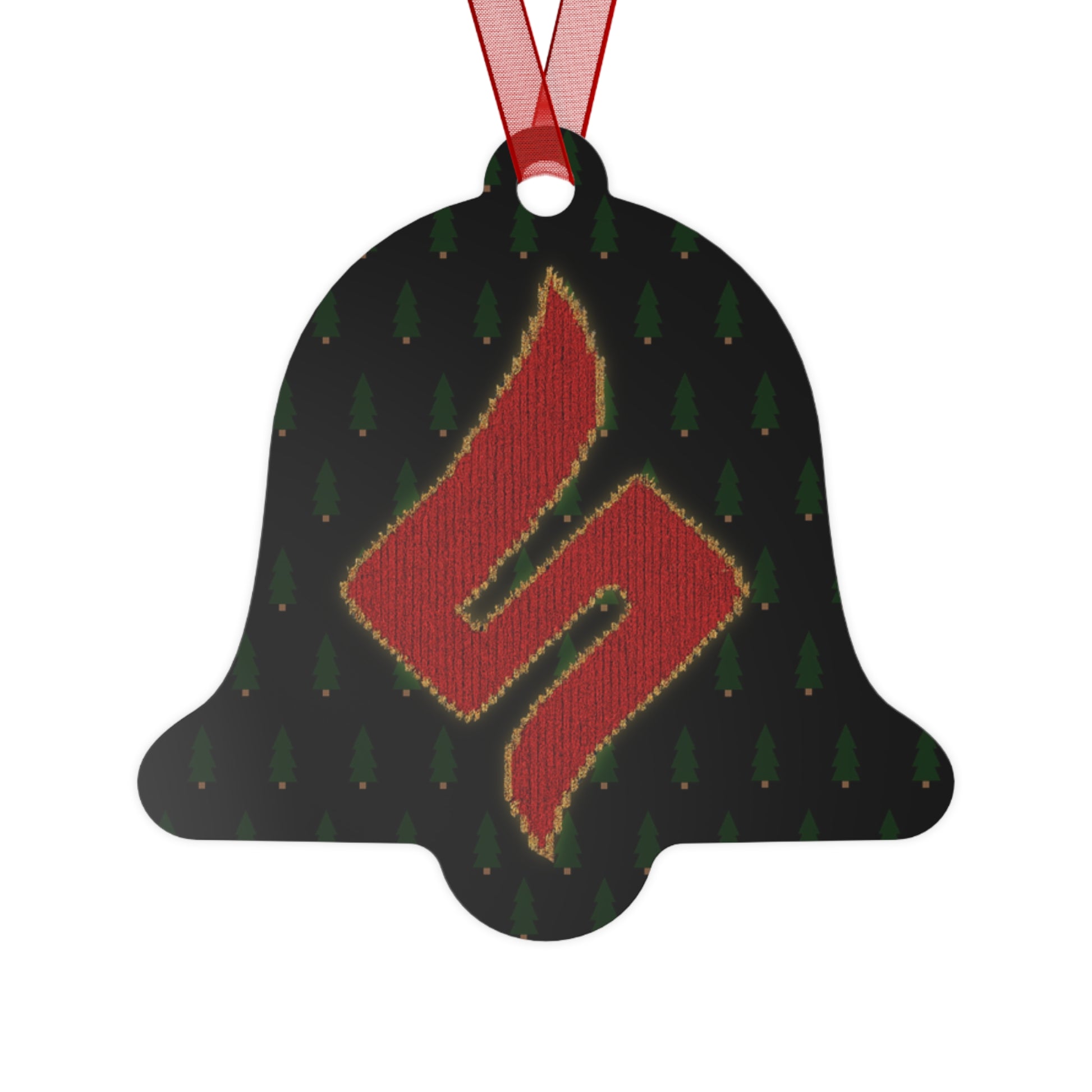 Sessmas Bell of Truth Approved by Shuli, Denied by Hack Comics Metal Ornament — Festive Shadow Figure & Red Emblem Holiday Bell Ornament