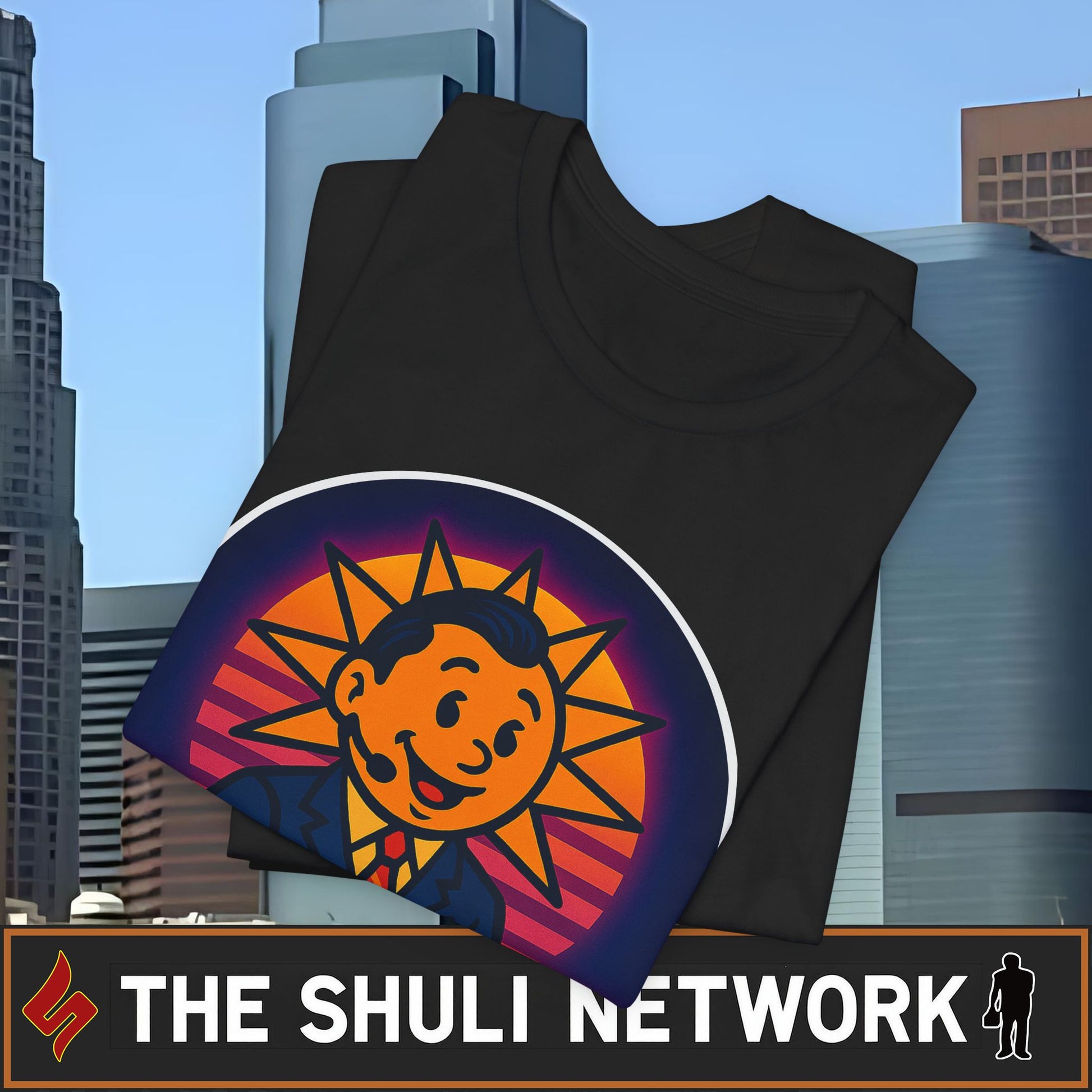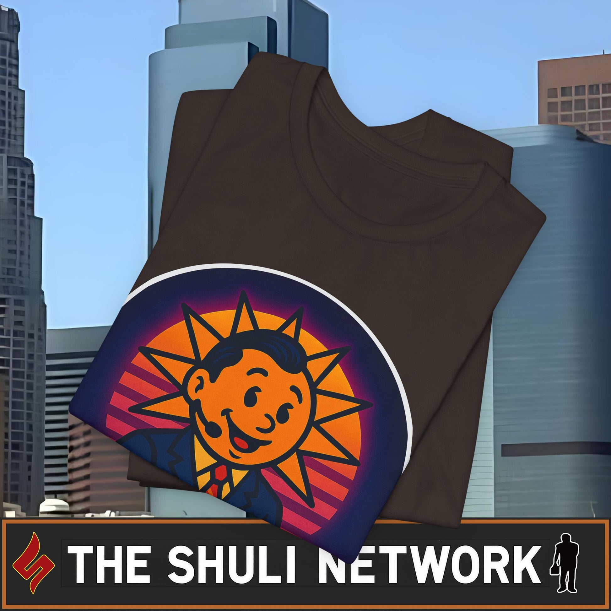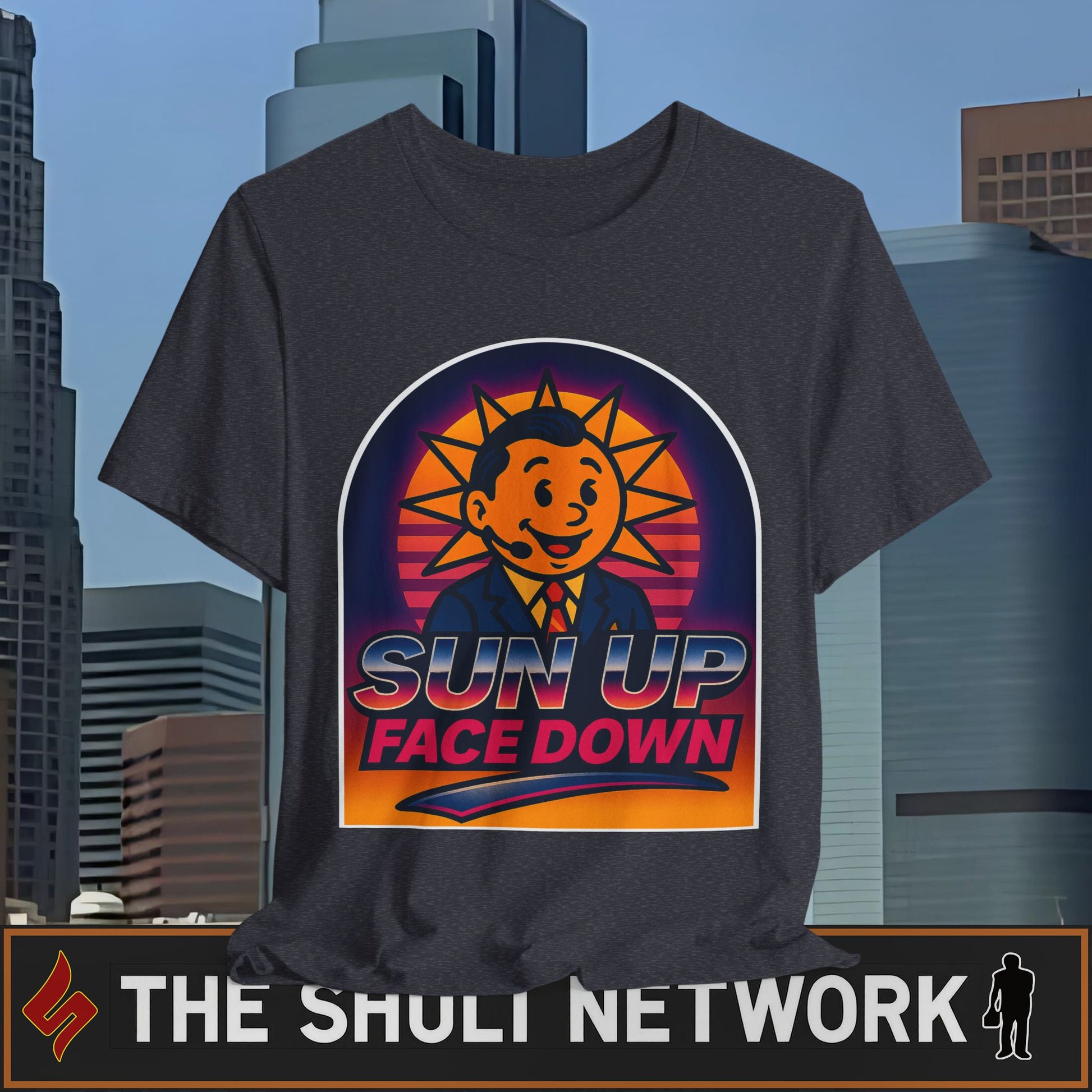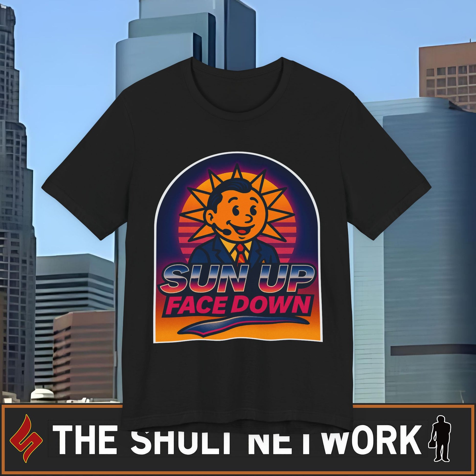 Wake up and immediately regret it with Sun Up, Face Down — The Shuli Network’s most unqualified attempt at a morning show. Hosted by a literal sun with anchorman hair and questionable credentials, this retro 80s parody tee brings the chaos of cue card confusion, Frog‑level mispronunciations, and chrome‑text optimism straight to your chest.