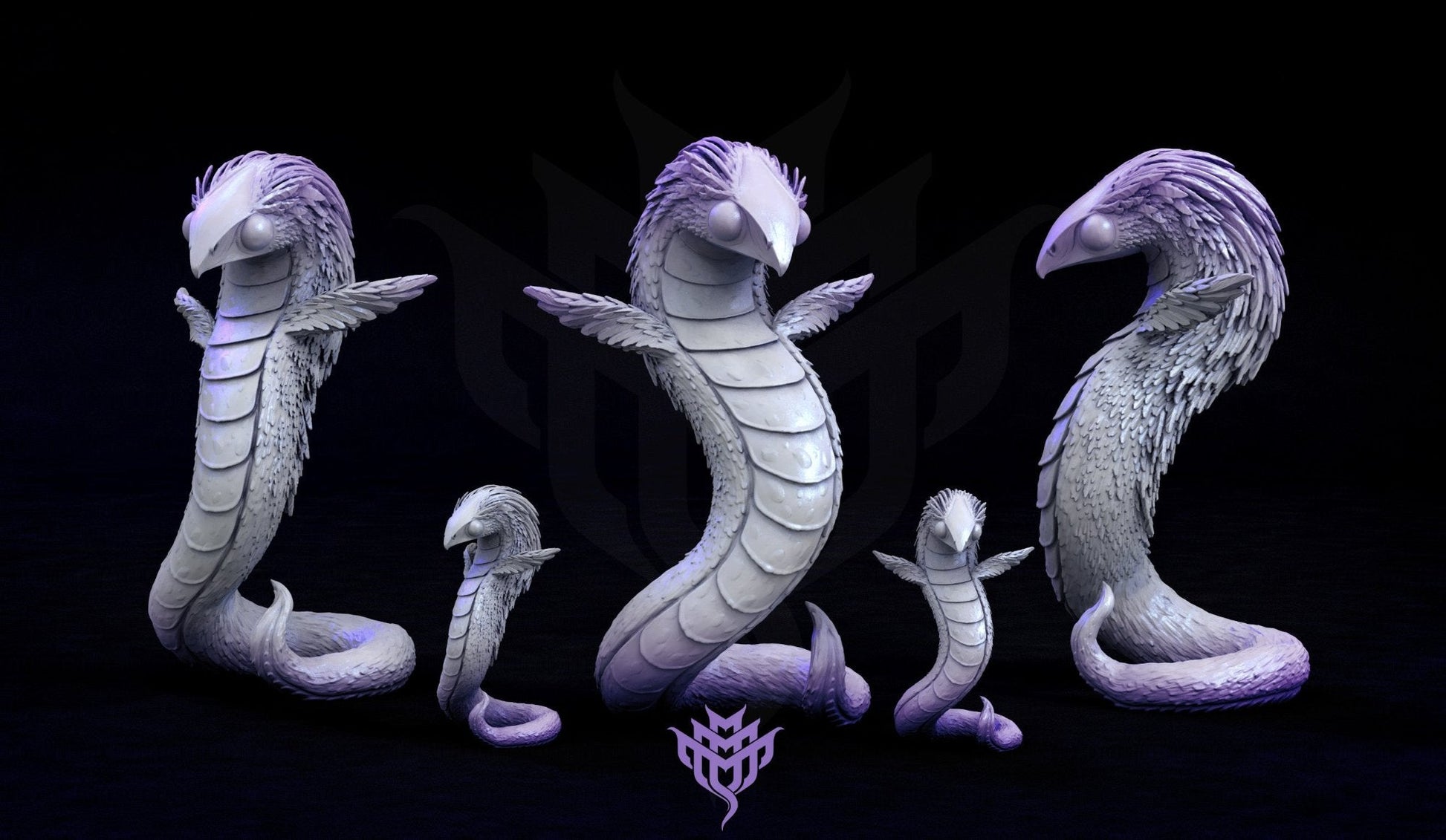 A collection of Vulture Wurm miniatures, representing mythical serpents with vulture-like heads, feathered wings, and multiple stages of life. Ideal for use in fantasy TTRPGs like Dungeons & Dragons or Pathfinder, adding a touch of eerie elegance to your collection or gaming session.